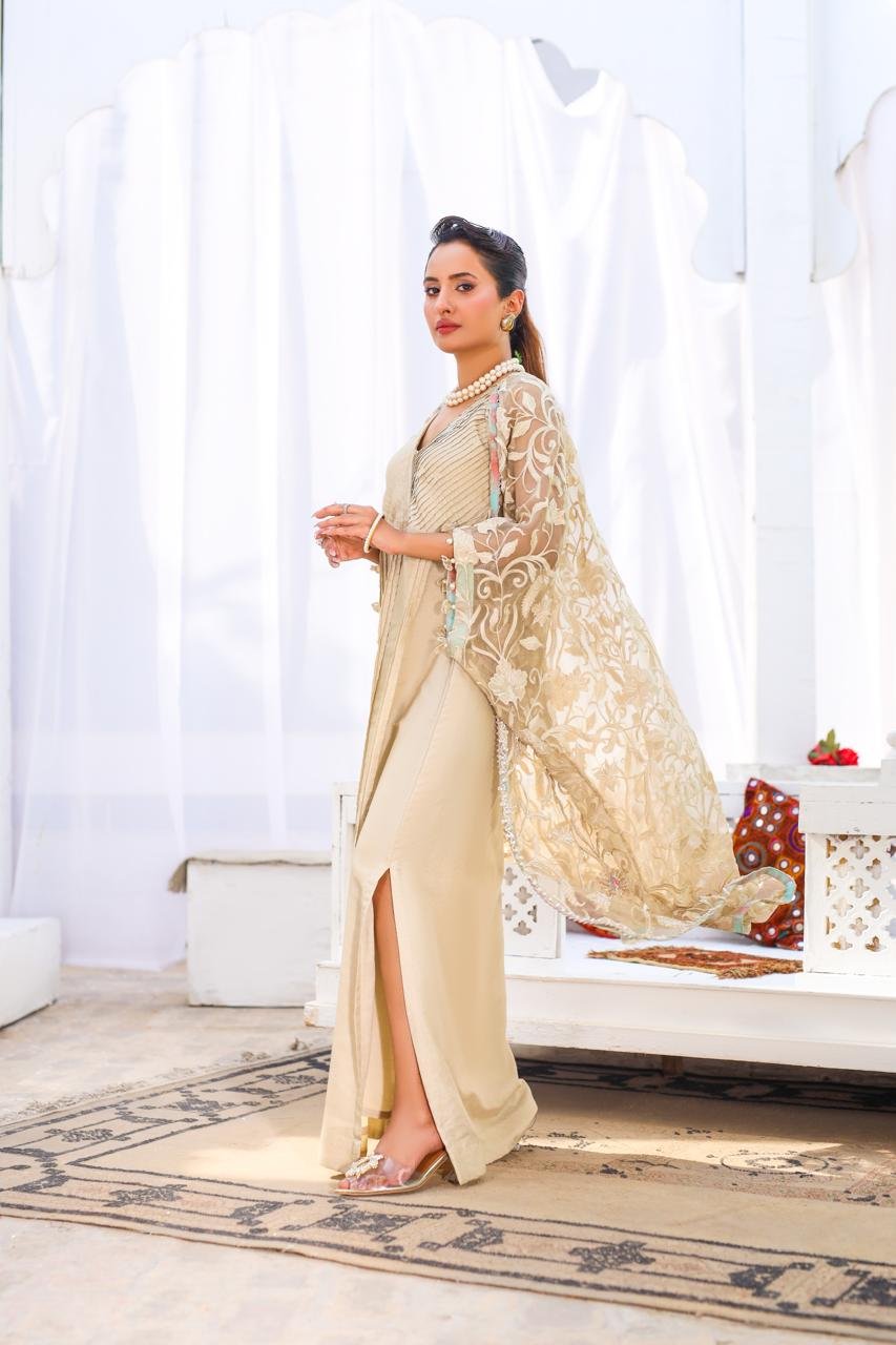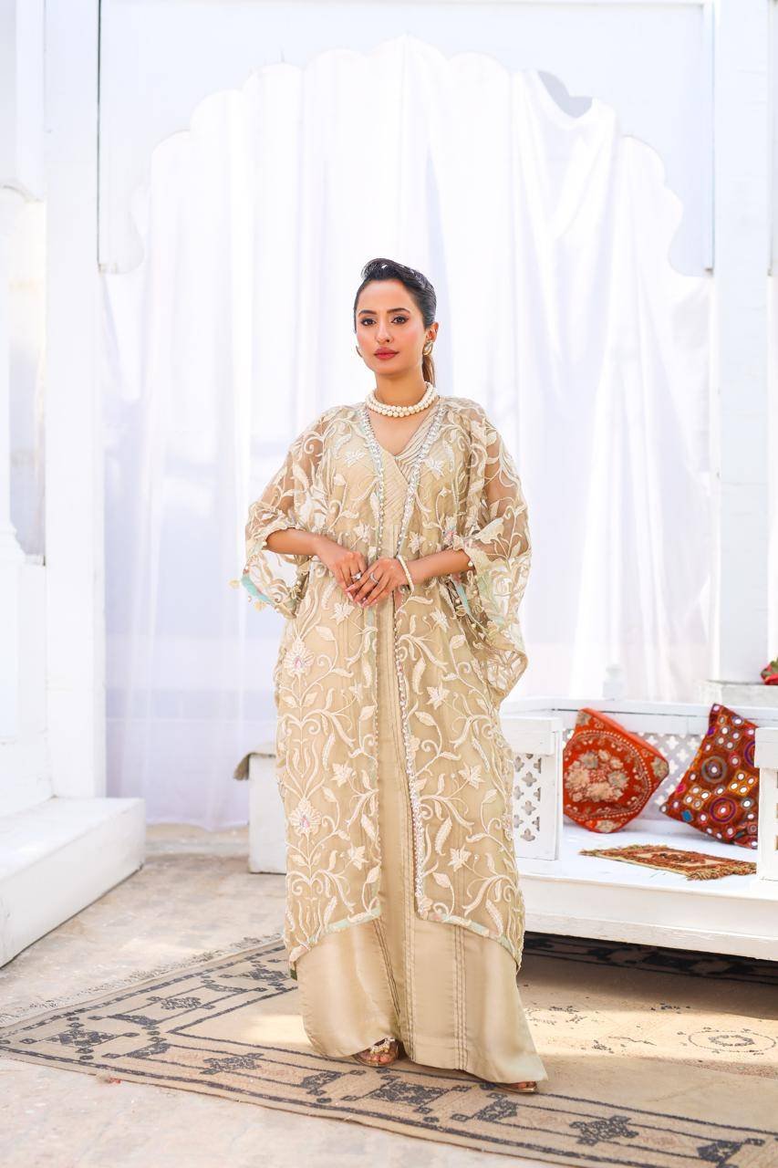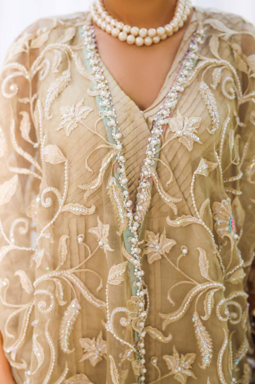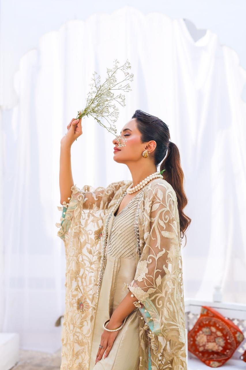 Crafted from pure embroidered organza, this ensemble features graceful Resham and French knot handwork detailing. It is paired with a pleated loom net inner and finished with a stunning tie-and-dye effect. Delicate embroidered floral accents, pearl embellishments, and handmade tassel details add a touch of timeless elegance.