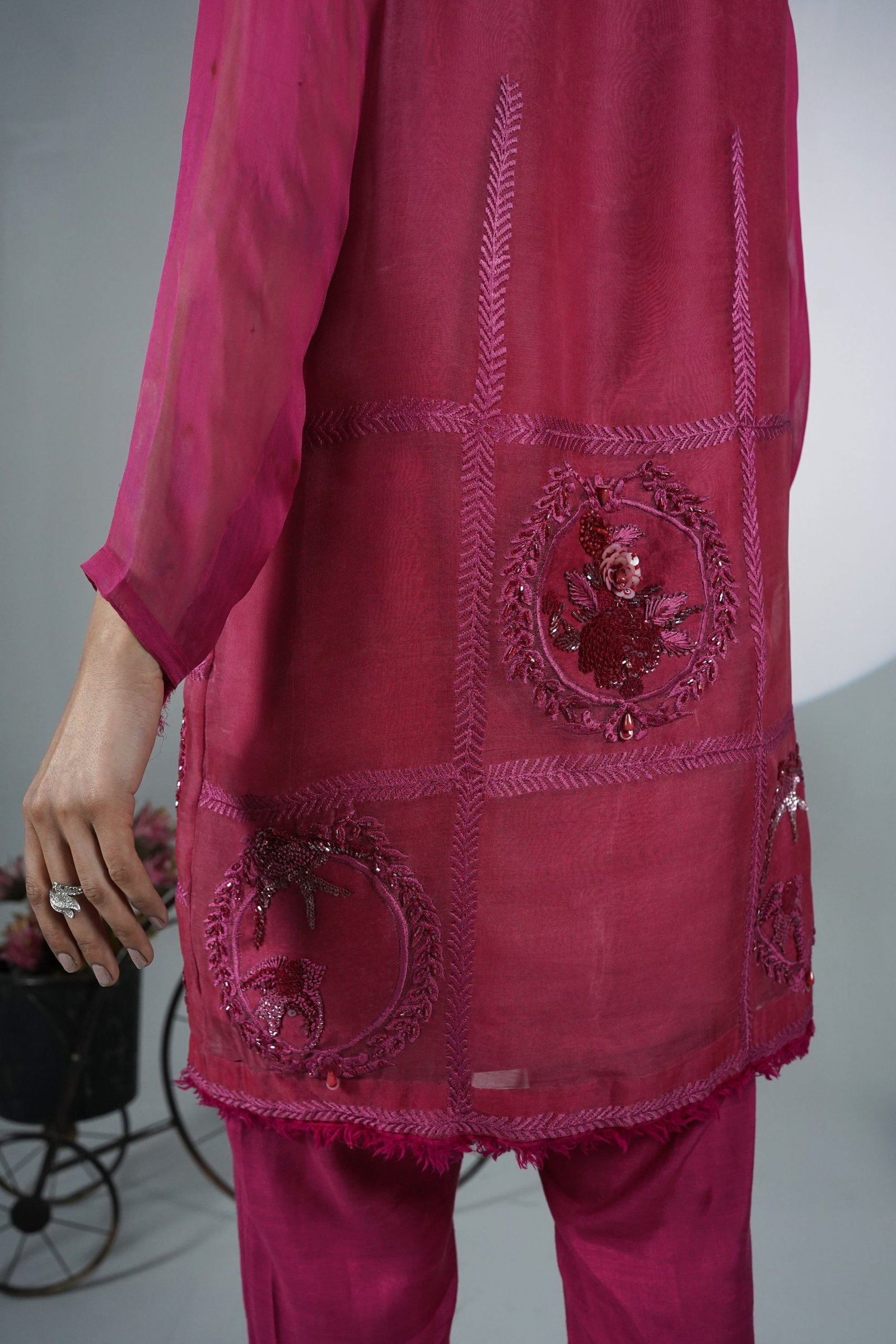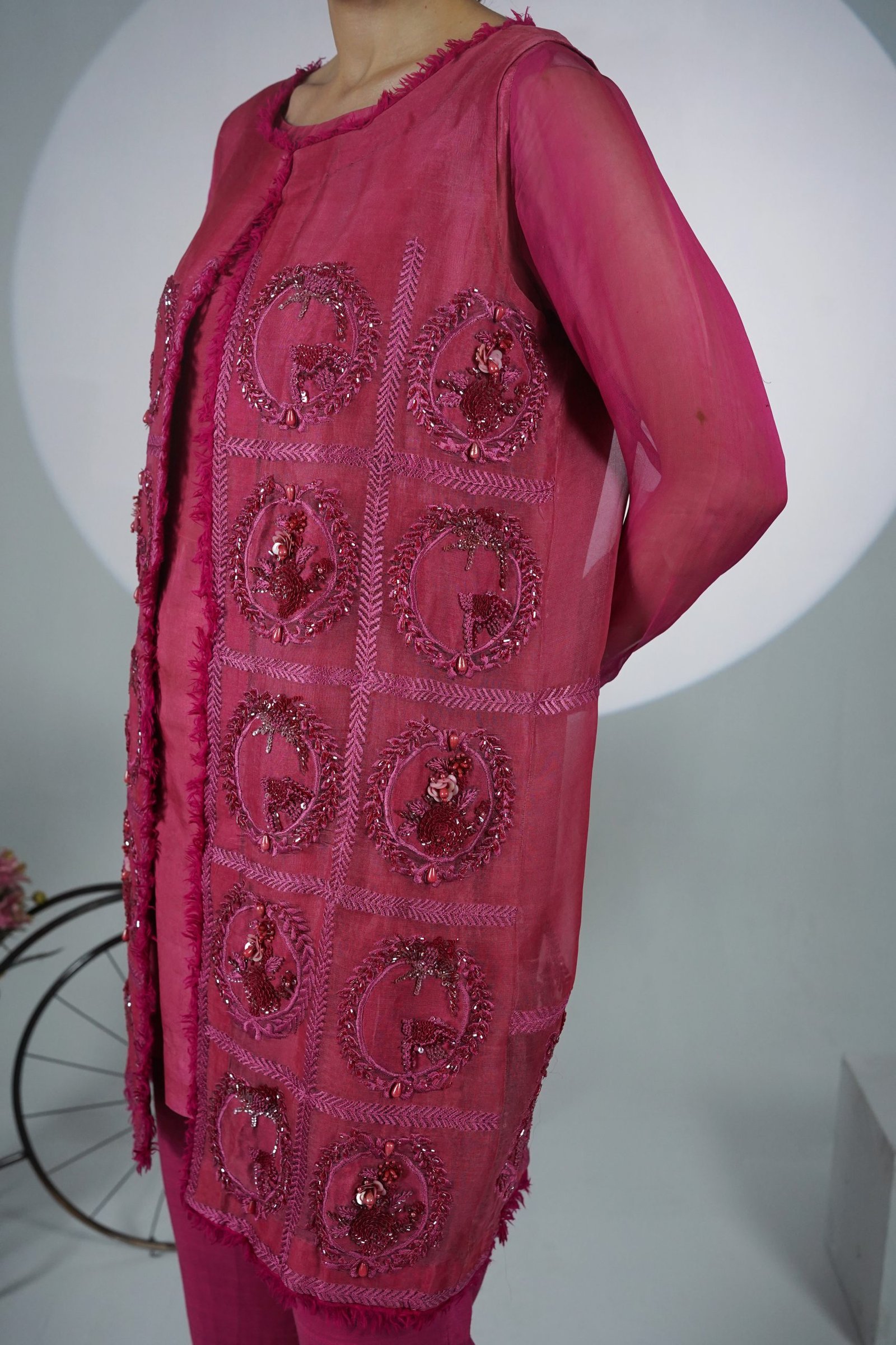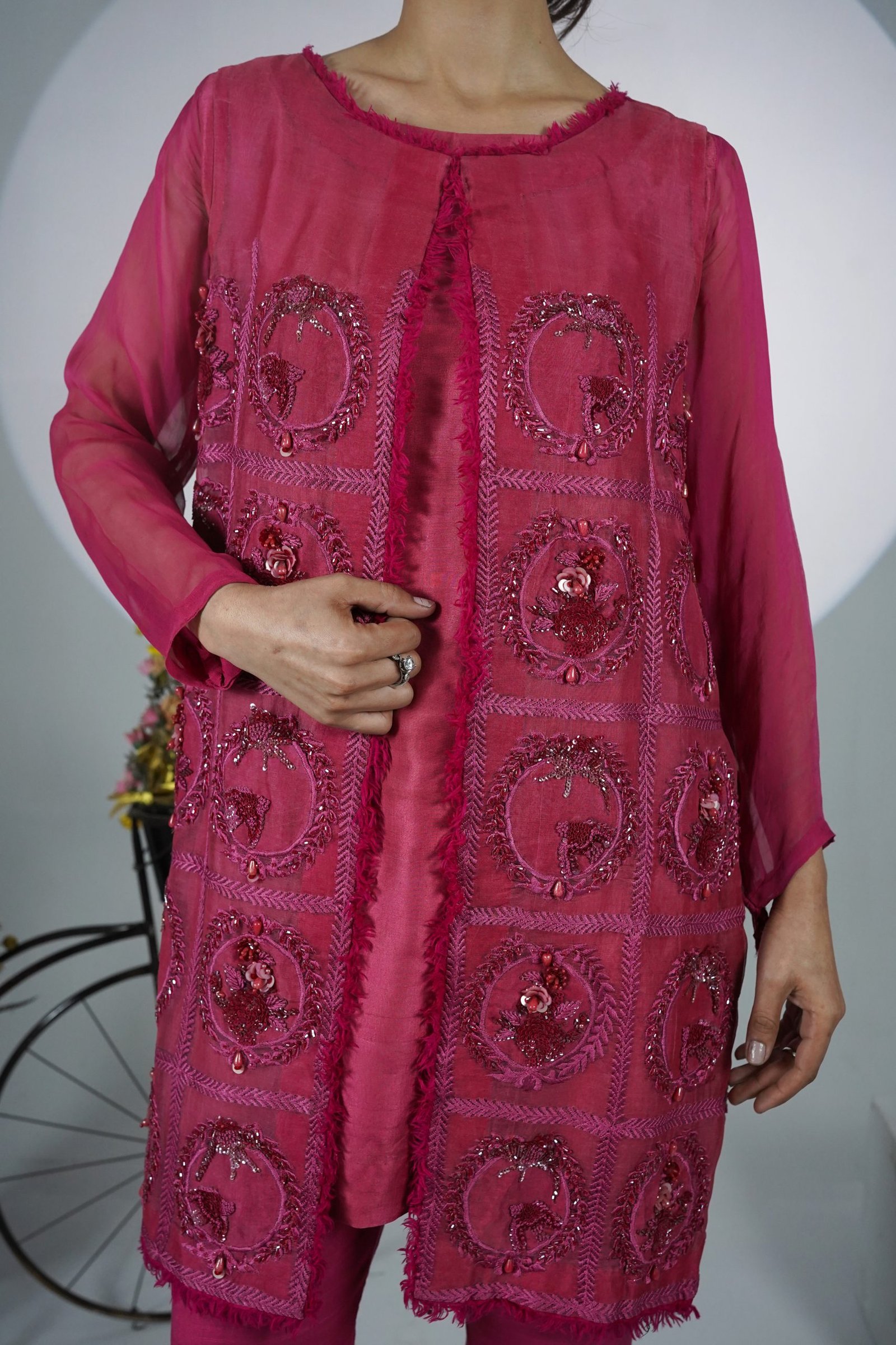 This sophisticated ensemble features a pure organza jacket layered over a Korean silk slip and pant for a refined, modern look. The design is enhanced with chiffon sleeves, adding a soft and graceful touch. Elegant frayed edge detailing and hand-made raisham thread work highlight the craftsmanship. A perfect choice for festive events and formal occasions.