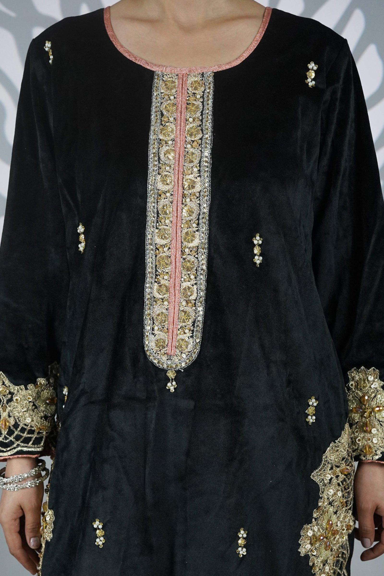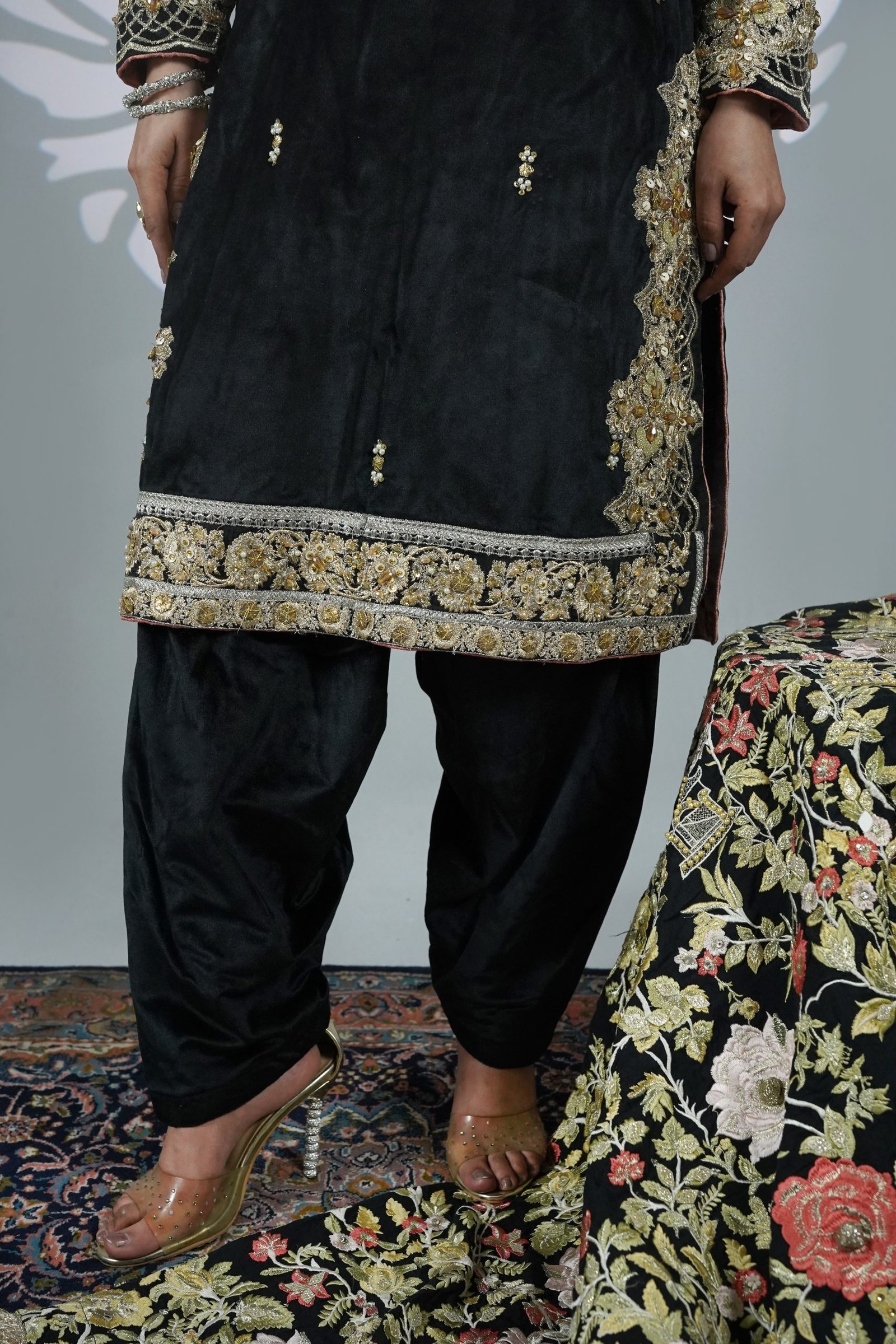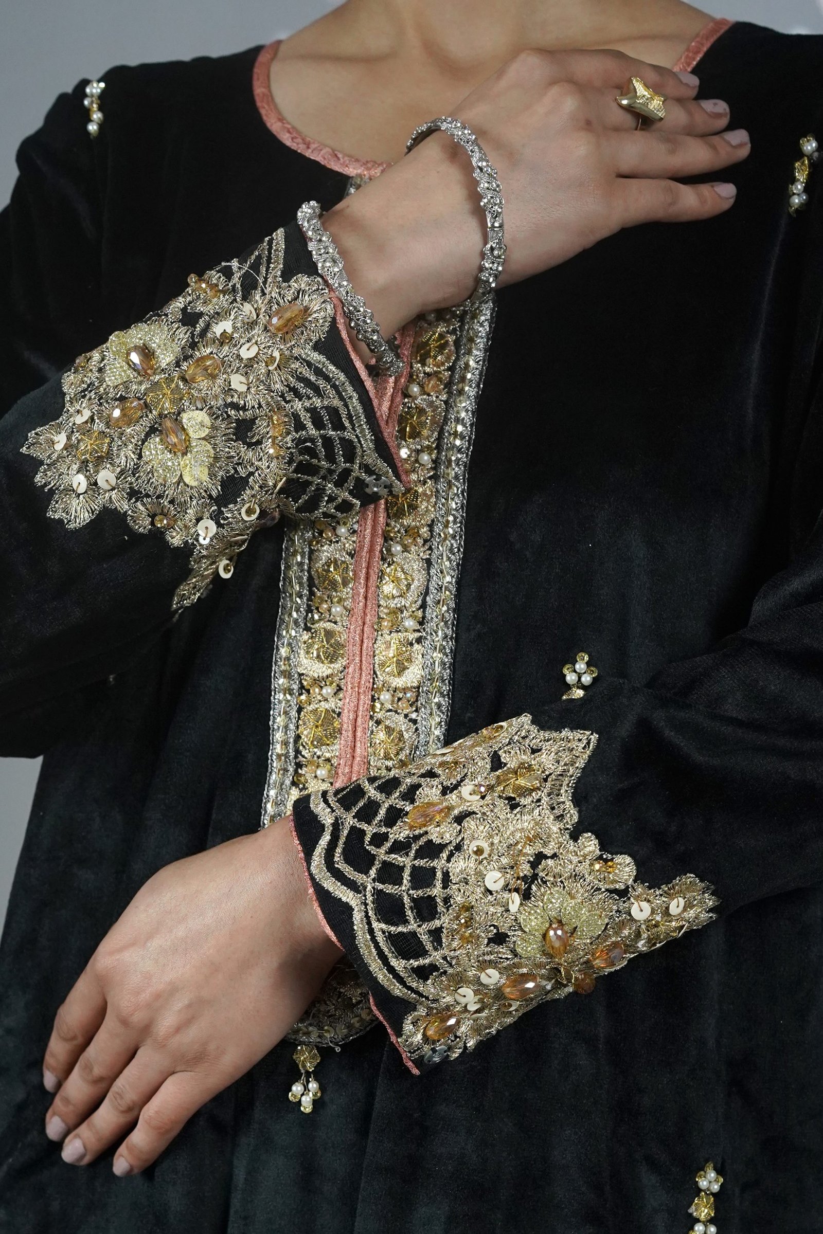 This luxurious outfit features a velvet shirt and pant, offering a rich texture and regal appeal. It is paired with a stunning multi-head embroidered shawl, meticulously crafted with hand-made detailing. The shawl is adorned with premium dabka and naqshi work, adding depth and elegance. A perfect statement ensemble for weddings, festive, and formal occasions.
