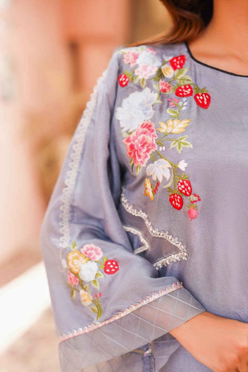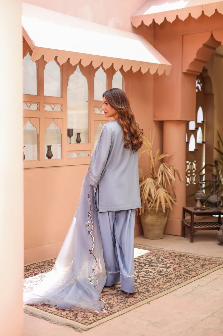 An exquisite ensemble crafted from pure Loome Net with delicate organza detailing, featuring a blend of elegant handwork and fine machine embroidery. Intricate scalloped edging and a gracefully designed Farshi Shalwar adorned with hand embellishments elevate the overall sophistication.