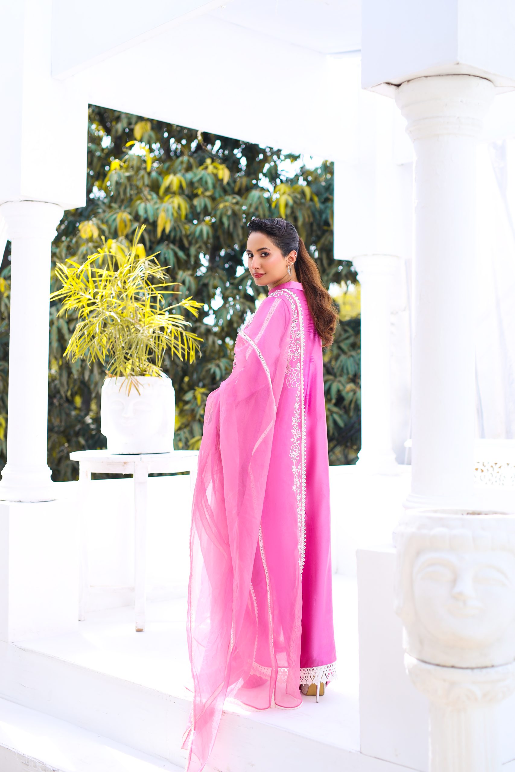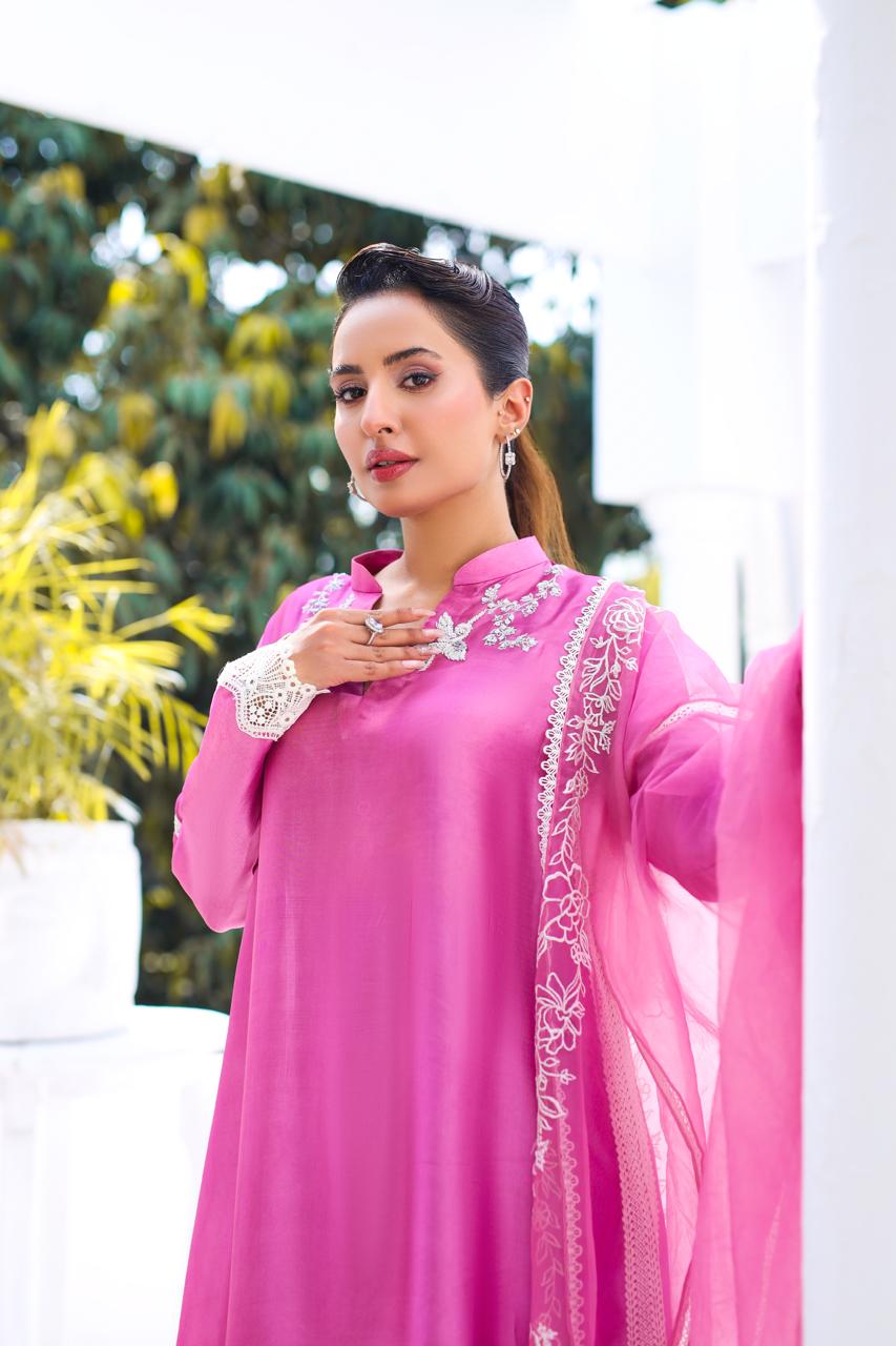 Pure sheesha silk fabric with elegant appliqué work, also embellished with handmade detailing, and embroidered organdie with lace detailing. Wide leg pants in super chic elvish silk fabric.